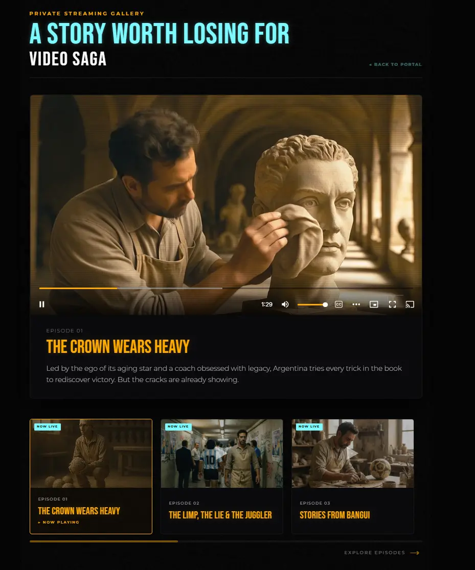 Our first release is Argentina 1990: the full story of Argentina's World Cup campaign in Italia 90. 36 illustrated chapters. 20 cinematic video episodes. 32 original compositions. All delivered through a private membership portal.